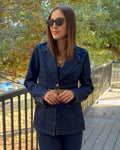 A polished denim blazer with clean lines, smooth structure, and classic gold-tone button detailing. Designed in a deep washed denim that pairs effortlessly with everything from tees to trousers — and especially with the matching wide-leg jeans for a full set. A modern take on a classic piece that elevates denim into something refined and versatile.