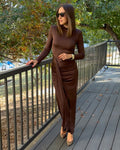 A sleek, high-impact maxi dress designed with a smooth, lightweight feel and a refined minimalist silhouette. Designed with long draped panels at the front that create a fluid effect and a side slit for easy movement. Easy to style for dinners, events, or nights out, it’s a statement piece that looks instantly polished with almost no effort.